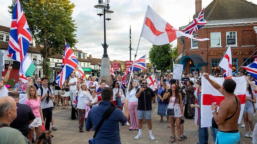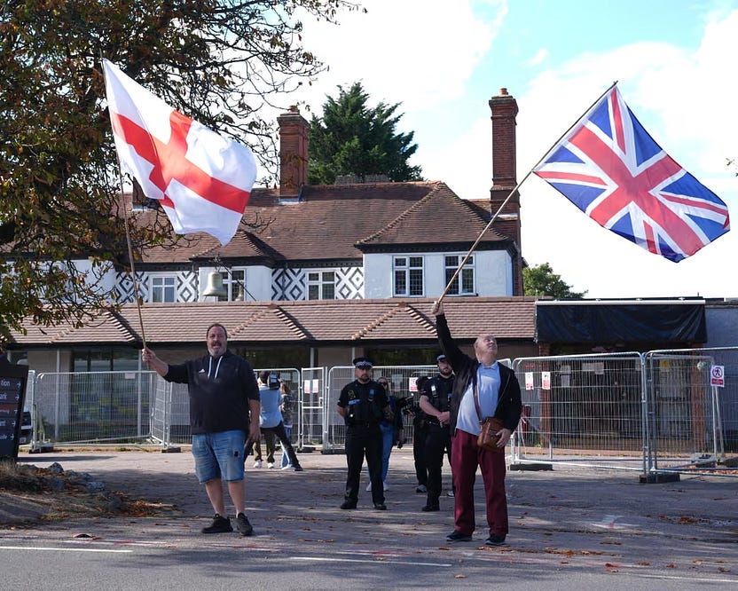 One of the reasons for the current bout of flag flying is that, due to overcrowding in the detention centres, asylum seekers are being housed in hotels. The current dispute centres around the ‘glamorous’ Bell Hotel in Epping. An ugly place, which the right-wingers think is the reason people come to the country.